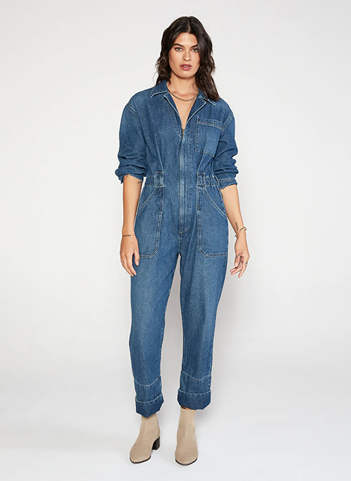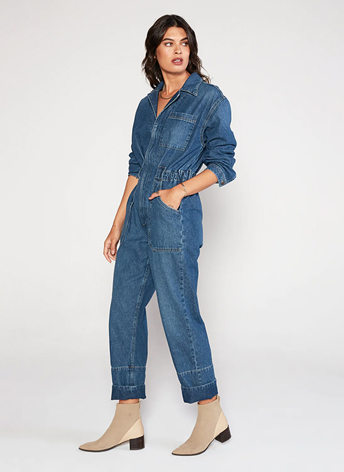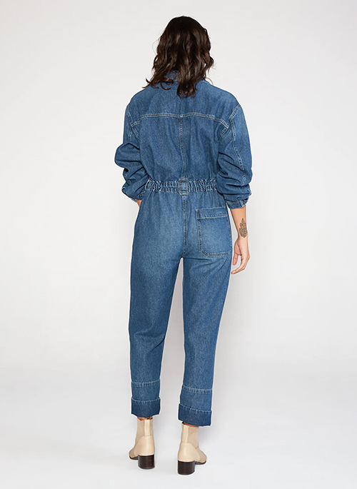 A vintage flightsuit is reimagined with feminine proportions. Crafted from a hearty denim chambray fabric with light sanding for natural wear.