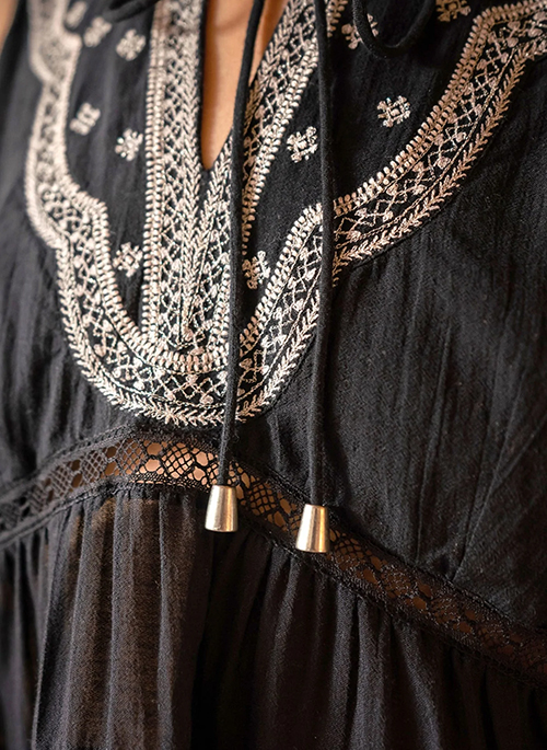 Delicate embroidery with subtle silver thread, decorate the yoke area on this sleeveless top in a thin cotton /viscose blend. Fine cotton laces are inserted in between the tiers and the shape is loose fitted and appealing for all body shapes. Comfort and beautiful details combined.