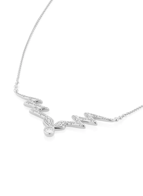 Merging a serpent and lightning bolt, the Snakebolt symbolizes rebirth and sudden illumination. Two snakes come together at a white cubic zirconia stone.