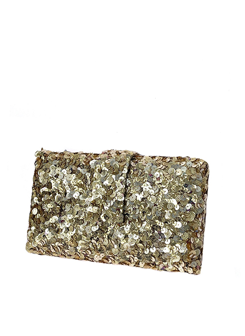 - Gold sequin hand embroidered clutch with a magnetic belt flap as closure