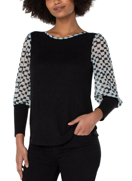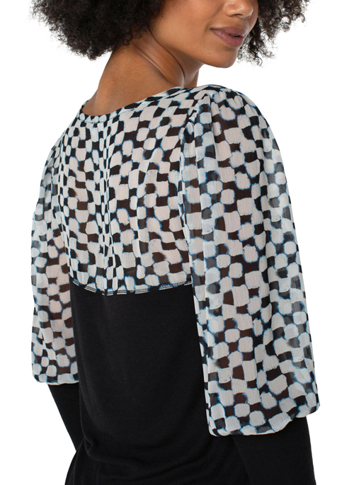 Our knit top with a beautiful painted checkered woven sleeves transitions effortlessly from season to season. This mixed media top looks beautiful when worn with denim!