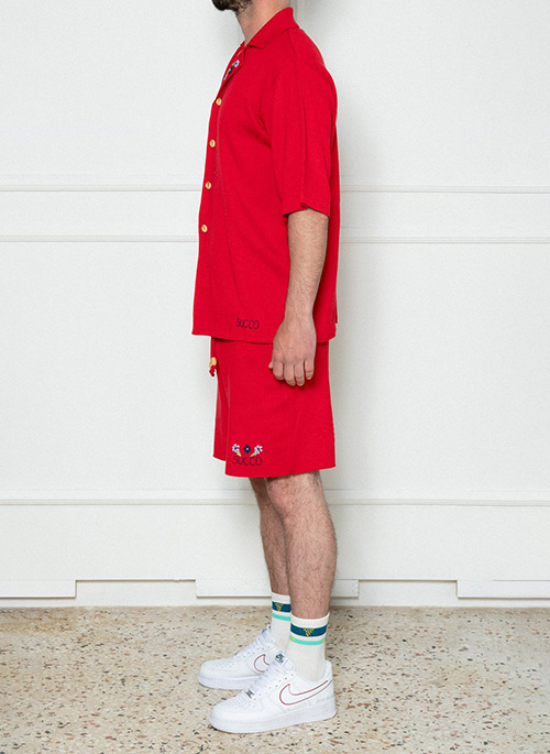 The Cotton Shorts in red are knitted from lightweight blend cotton and fits perfectly with his shirt in the same color.