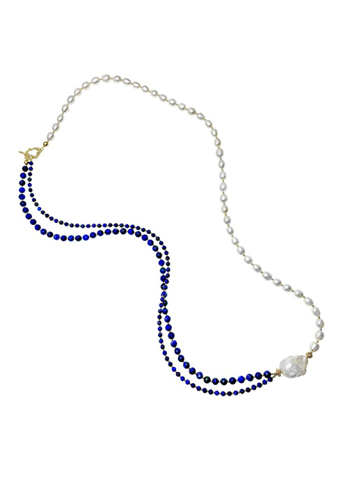 This handmade long necklace is made of round lapis, freshwater pearls, Baroque Pearl, and Japanese gold plated brass findings. It's simple but sophisticated which can be worn as a long necklace or double wrapped as a multilayered short necklace for different occasions. Match with dress, knitwear, or denim! Wear our Farra lapis earrings with a straw hat to complete your look.