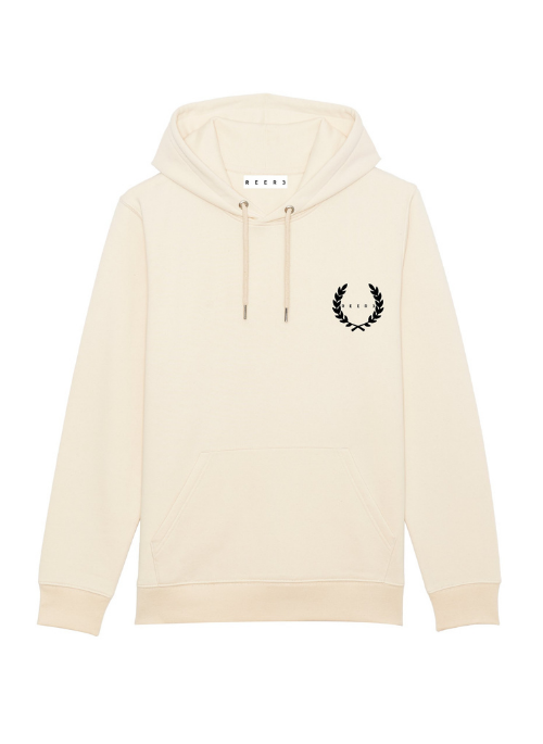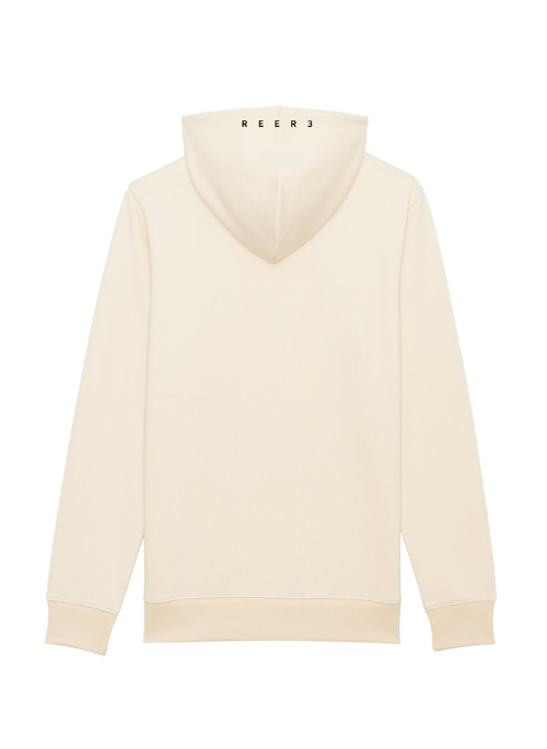 Designer hoodie made of GOTS certified organic cotton in a slightly mottled natural shade with black motif print. Wonderfully cuddly quality. Even after many washes, the softness remains. Fairly produced for a clear conscience. A real signature piece that impresses with a sporty hood, kangaroo pockets and elasticated cuffs. An all-season hoodie that also looks cool with a skirt or dress.