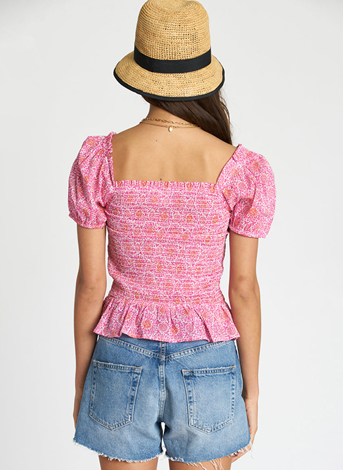A simple look with luxe details, the Laverne Top featured in a cotton lawn fabric with a delicate pink and white floral print, is a stylish, form fitting silhouette that can easily transition your look from formal to fun. Smocked bodice with ruffled peplum hem, subtle puff sleeves and square neckline complete the blouse. Pair this piece with your favorite dRA jacket to complete that chic, layered look.