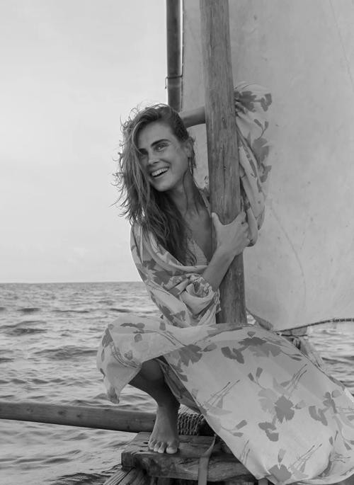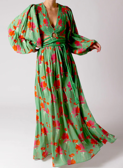 Behold our dreamy and super-packable new Leonie dress with a sexy V-neck and cutout waist. It's similar to our best-selling Farrah gauze dress, but Leonie is graced with extra-flouncy sleeves that billow in the breeze. The bodice's O-ring is a throwback to 70s lounge dresses but this whispery silhouette begs to be worn barefoot on the sand. Wrap the rope belt around your waist and set sail.