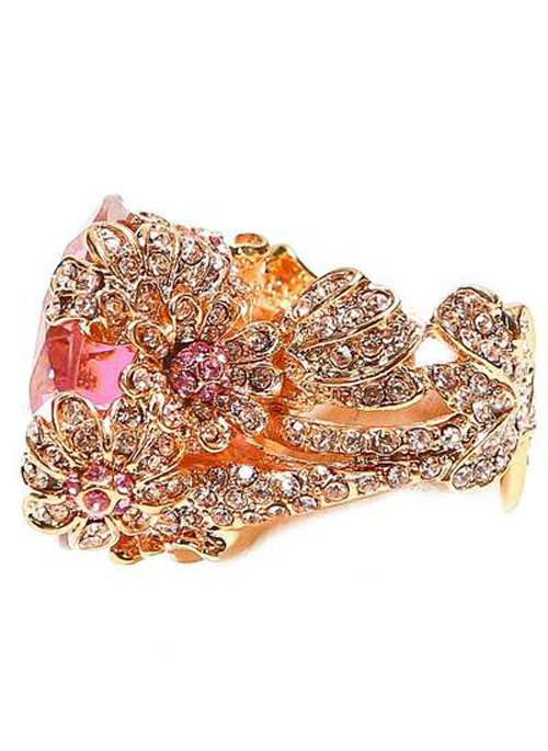 This oversized cocktail ring has a large pink center crystal rhinestone, and is faceted with a gold plated crystal rhinestone embellished floral pattern at the sides and band. This is a stunning piece that you will covet in your wardrobe for years to come.