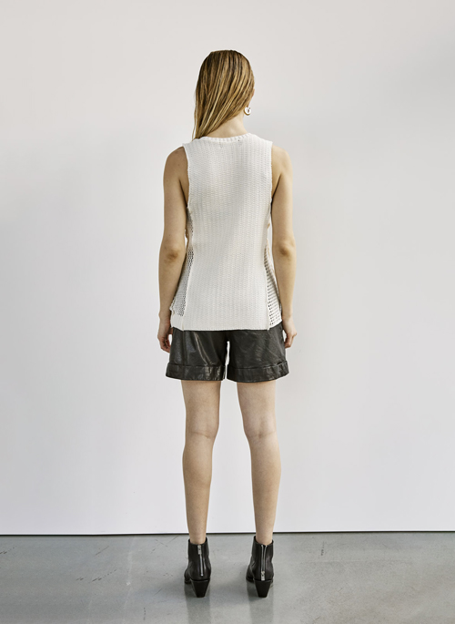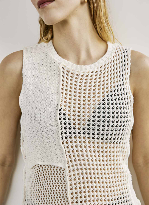 Sleeveless knitted vest with a round neckline, in a feminine lace knit pattern that is perfect for warm summer days, styled with your favorite shorts and a sandal. The vest is true to size, and we recommend that you choose your standard size. The model is 176 cm tall and wears a size XS/S.
