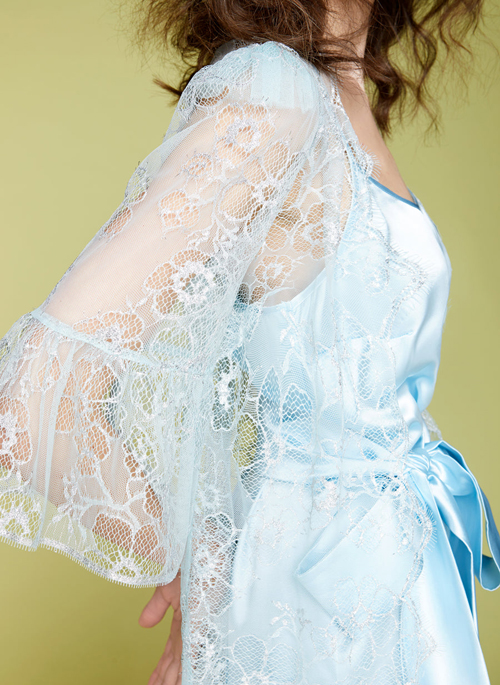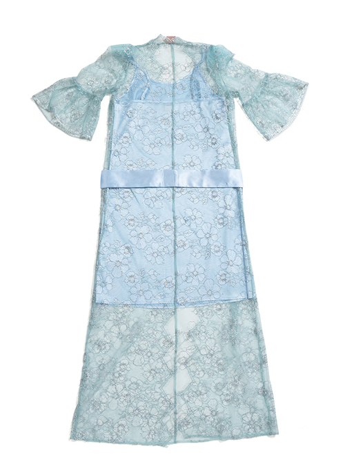 The outer piece is made of light and transparent floral lace, and the inner piece is made of satin fabric. The outer piece is open with three quarters sleeves and length under the ankle. The satin dress is with thin adjustable straps and has belt from the same fabric to cinch the waist.