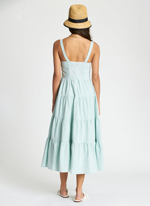 The Lilibeth Dress boasts a sophisticated look with romantic details. Cut in Green Striped cotton seersucker, this delicate tea length dress with its sweetheart neckline and flowing tiered skirt, makes it the perfect outfit to take you from lunch socials to evening soirees.