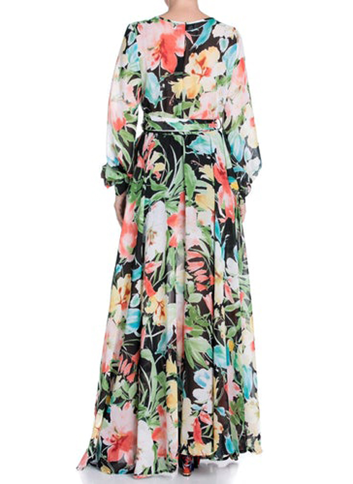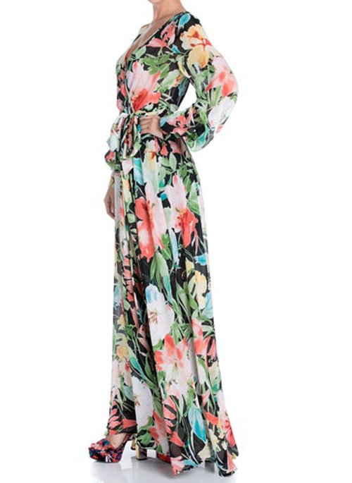 This 70's inspired maxi dress features a sexy cross front V shape surplice neckline. The elasticized waist adjusts to fit a range of sizes and has an attached self-tying belt at the right-hand side seam. The bell sleeves add a hint of retro glamour. The sheer chiffon fabric has a soft hand and features an all-over large-scale watercolor-inspired floral print. The full, sweeping circle maxi skirt is perfect for making a dramatic entrance to any event. The skirt is partially lined.