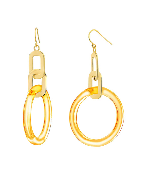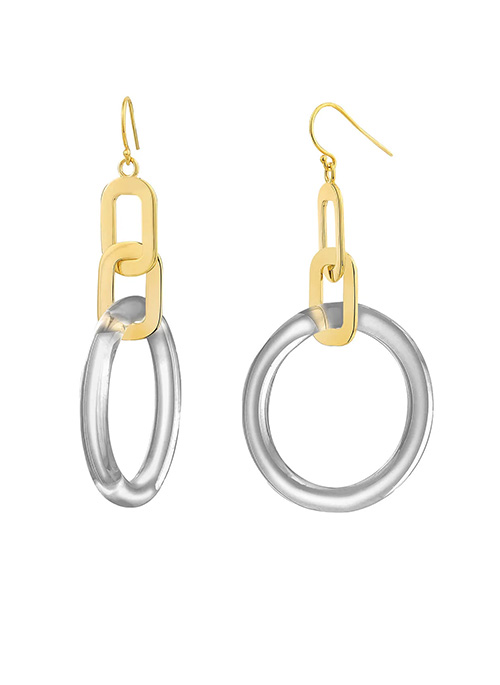 These drop and dangle earrings are a statement must-have. The lucite mixed with the golden metal is a silky and smooth design that can be worn for any occasion. The paperclip links are a elevated for a luxe look.
