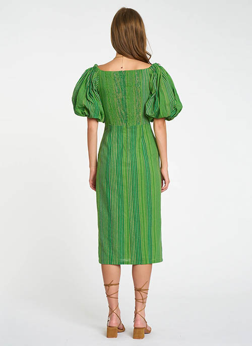 Effortlessly chic, the Lisa Dress offers sophisticated details. With a subtle sweetheart neckline and elastic sleeve design that allows for a flattering off-the-shoulder look, its billowing balloon sleeves will be sure to turn heads. Featured in a gorgeous medley stripe showcasing varying Shades of Green, the Lisa dress is topped off with smocked back detail to reveal a fitted, mid-length silhouette that makes a stylish statement.