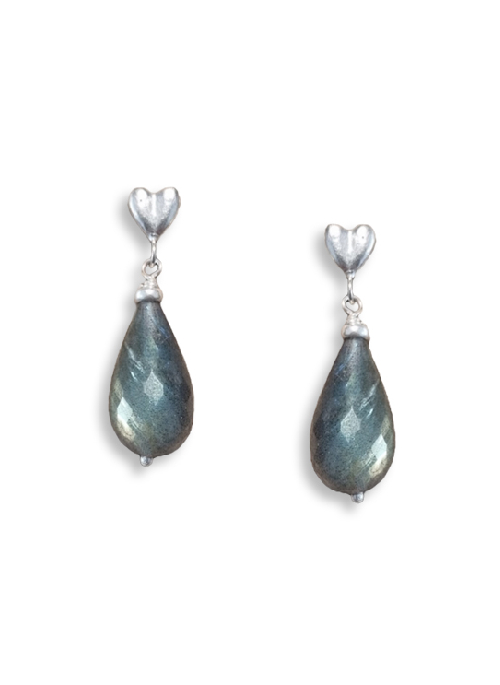 Little Rock Labradorite Love Earrings feature sterling silver with heart shape earring tops and facetted blue flash Labradorite drops. For those lovers of Silver, these earrings are an everyday design that can easily be dressed up for a formal occasion.
