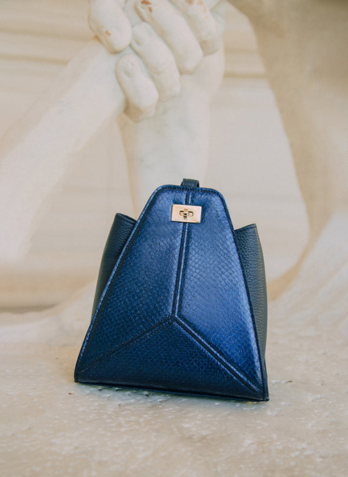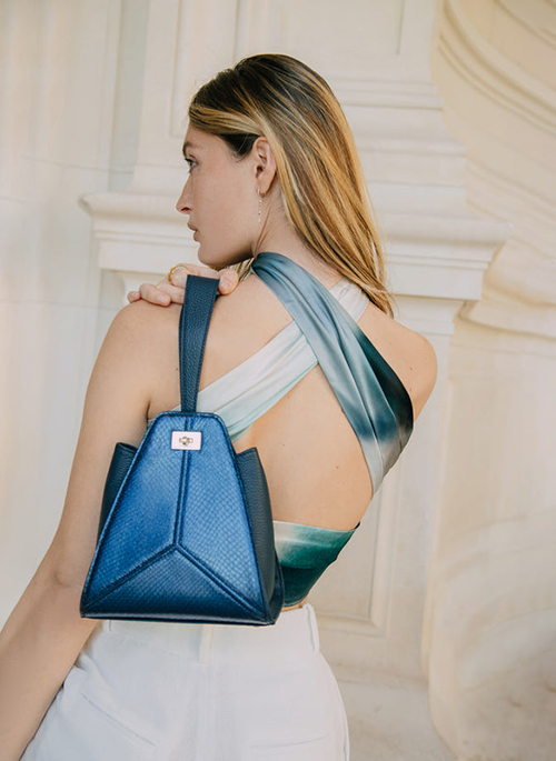 This iconic 30’s Modernism-inspired wristlet bag is a red carpet favorite. Made in France, the Livia is a celebration of craftsmanship and sustainability with its signature triangular shape and salmon patchwork. Made of ICTYOS Squama Luxe, a French marine leather made of recycled salmon skin. Creativity, craftsmanship and circularity made beautiful.
