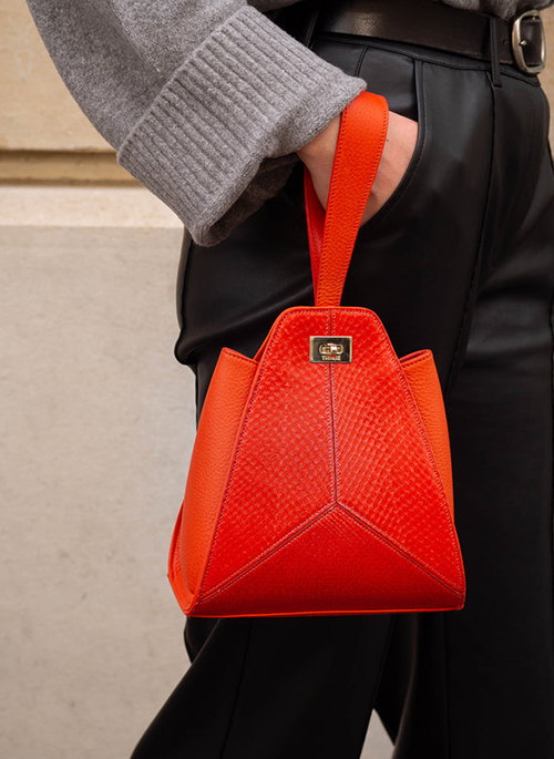 This iconic 30’s Modernism-inspired wristlet bag is a red carpet favorite. Made in France, the Livia is a celebration of craftsmanship and sustainability with its signature triangular shape and salmon patchwork. Made of ICTYOS Squama Luxe, a French marine leather made of recycled salmon skin. Creativity, craftsmanship and circularity made beautiful.
