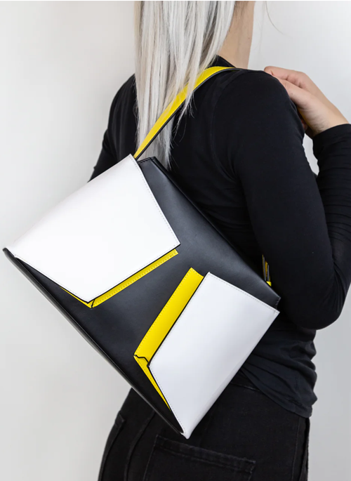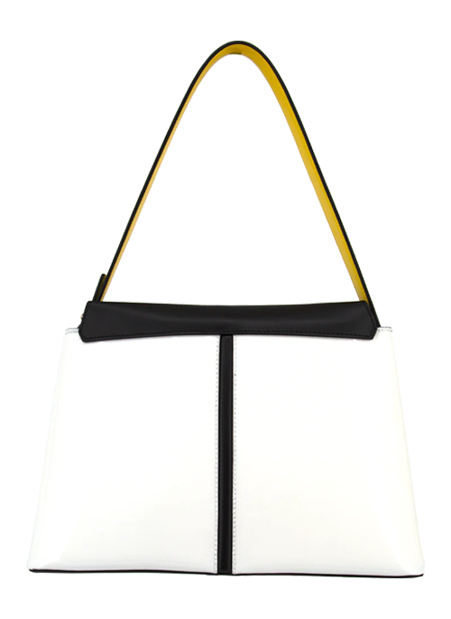 Calfskin shoulder bag with adjustable handle. Two pvc front pockets that enhance the geometric cut of the bag and a main compartment. Light gold plated finishes. Handmade in Milan with fine materials. Details: Material:100% Calfskin leather - PVC Pockets - Lining 100% Polyester Size:32 x 22 x 9 cm Color:White/Summer/Black