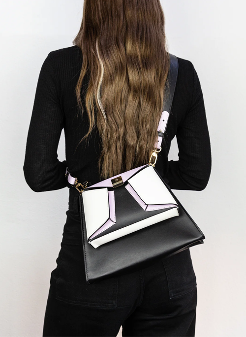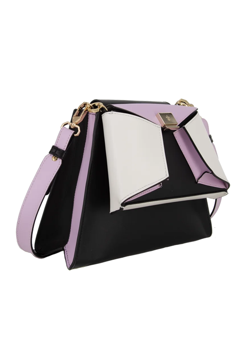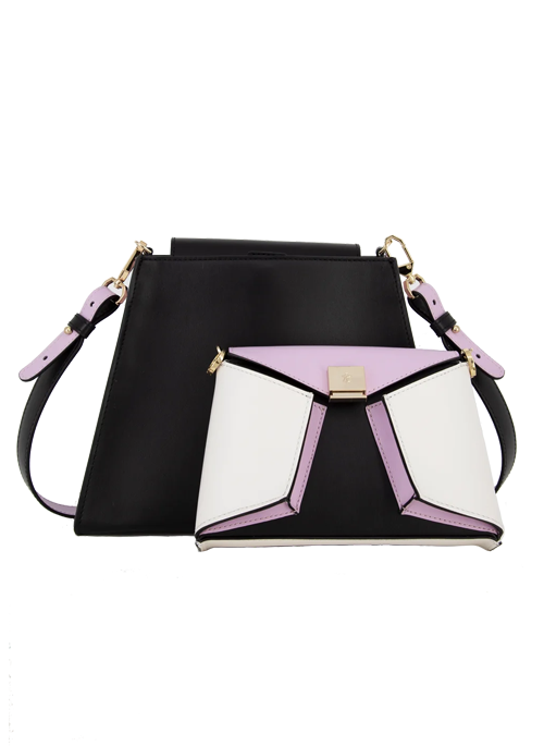 Double calfskin handbag with removable handle and adjustable shoulder strap. The smaller pochette is attached to the second bag and they can be used together or separately for different styles. Handmade in Milan with fine materials. Details: Material: 100% Calfskin- Lining 100% Polyester Size: 27x20x9 cm Color: Lilac/Black/White