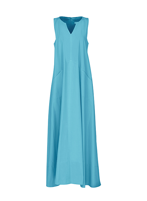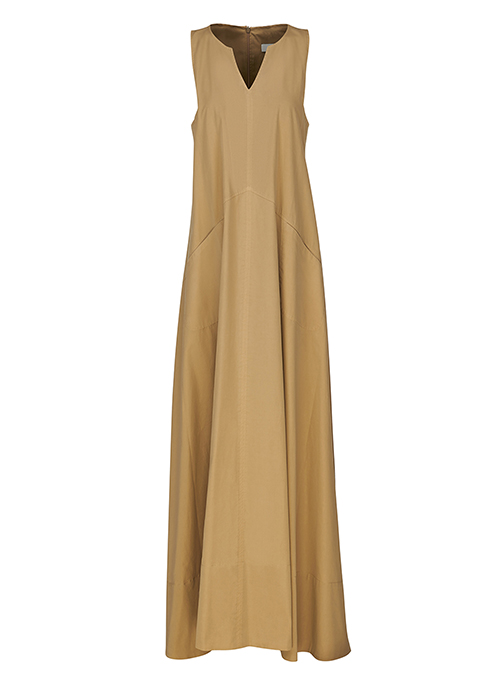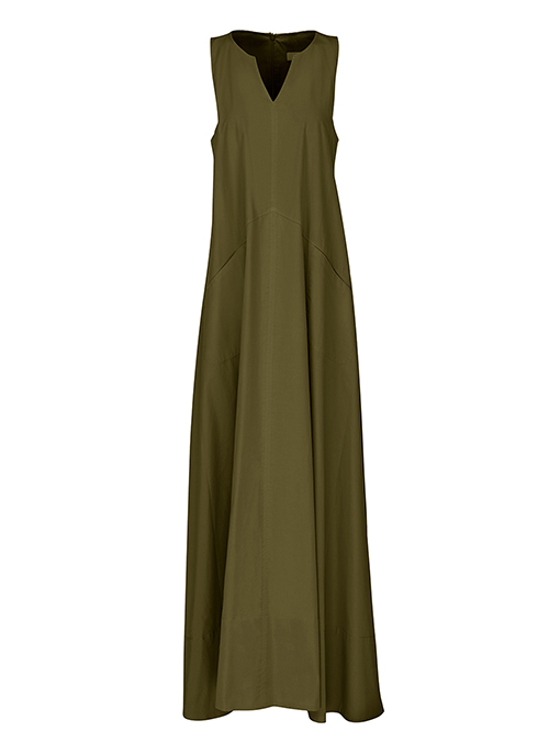 Long dress with a contrasting hem made of Supima cotton. It features a V-neckline, patch pockets on the seams, and an architectural cut on the back.