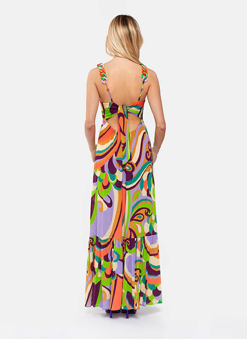 Vibrant long dress in the fresh shades of the Onda print will fill your summer with glamour. Playful colored chains frame the V-neckline and make this dress unique. A graceful final flounce makes this long dress even more refined. Equipped with a sensual back closure, it is available in shades of lilac and turquoise.