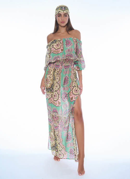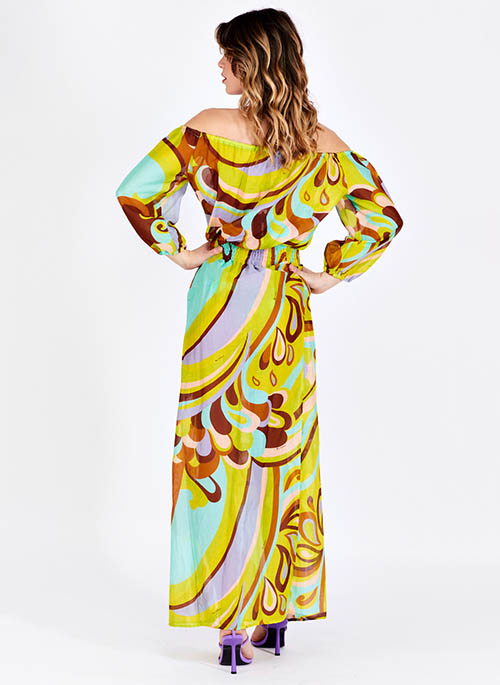 Versatile cotton and silk dress made in precious paisley motifs or in sparkling waves. Passepartout for the summer, perfect to wear both on the beach and in the city. Fresh, light and fluttering, this maxi dress will accompany you from morning to night. If the comfortable drawstring highlights the waist, enhancing the silhouette, instead the boat neckline and wide slits give an intriguing touch to the outfit.