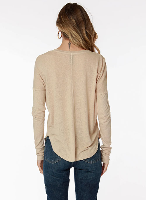 This drop shoulder style features raw edge details at the shoulder seam and hem. Designed with a hi-low curved hem, this long sleeve is a classic.