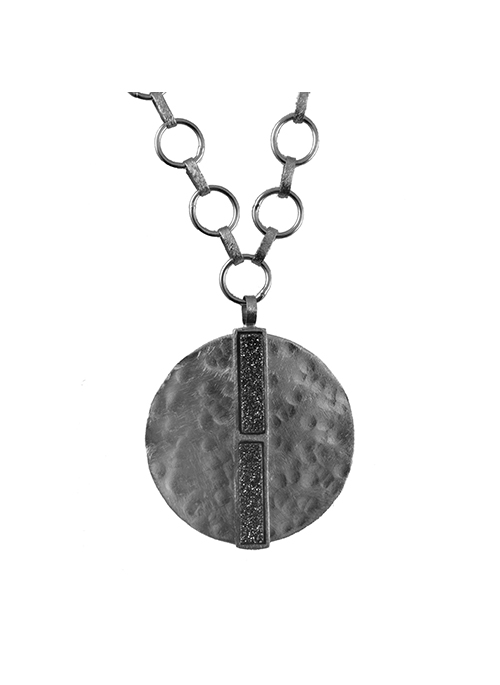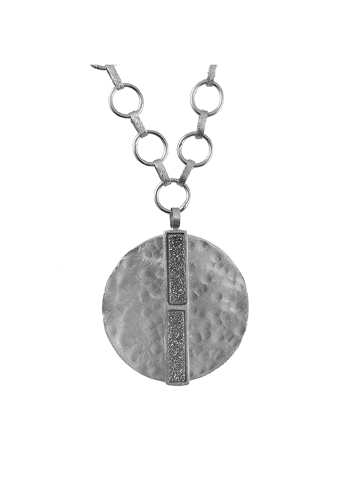 Details: Short necklace with hammered metal pendant with two stone bars.