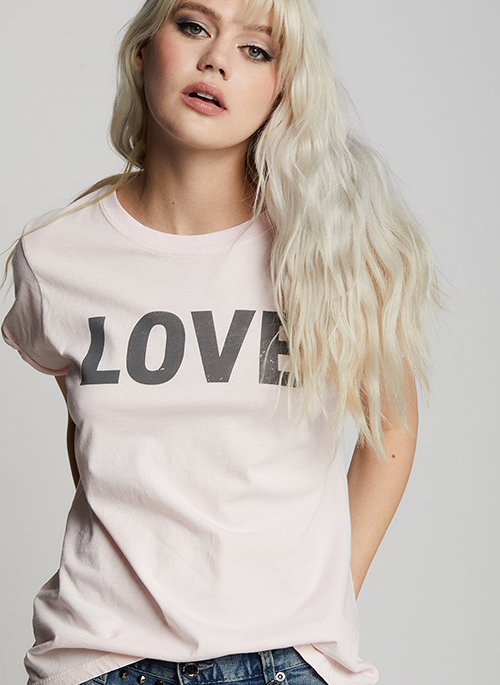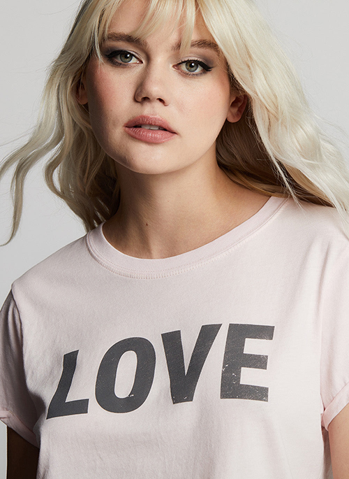 L-O-V-E. Our soft pink LOVE tee is made with cotton fabric, a crew neckline, cuffed short sleeves, and a feminine fitted style.