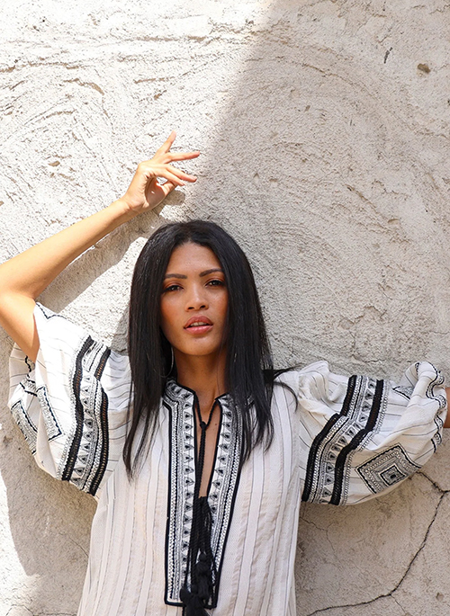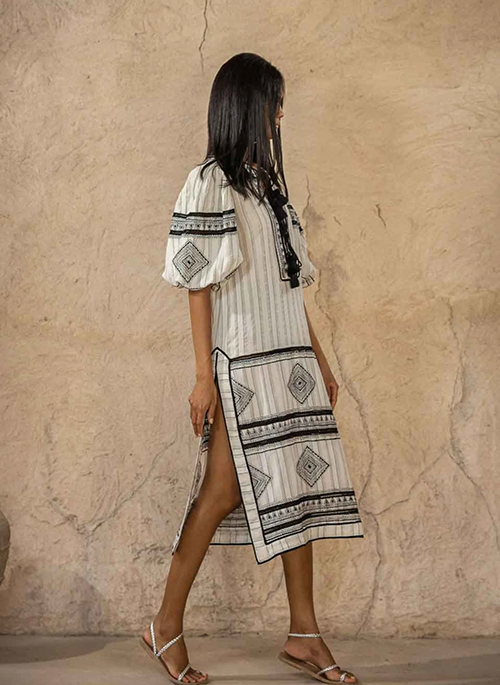 One of our all-time favourites! Timeless and made to last for many seasons. It has a straight, easy cut with high side slits and a soft volume sleeve. Lots of attention paid to details; from delicate lace inserts, contrast colored pipings to fine geometric embroidery motifs. The perfect kaftan dress for summer in the city or for tropical escapes!