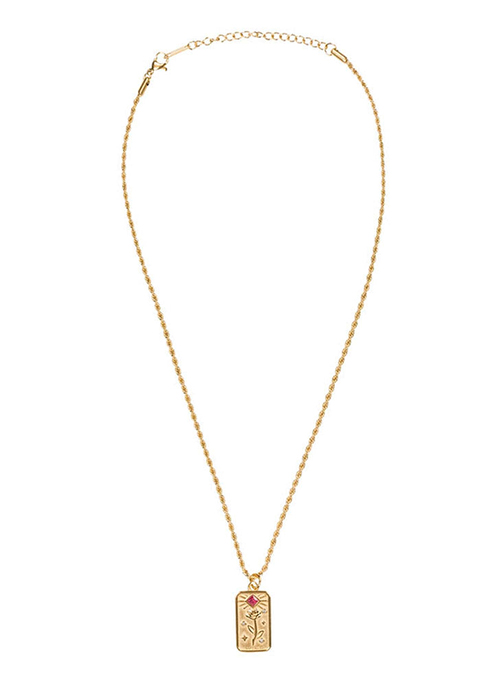 Crafted from 18K gold plated steel, this lover's tarot card engraved pendant necklace was designed with the true romantic in mind. There is an eye catching magenta hued rhinestone anchored above the rose adding just the right amount of sparkle. The pendant dangles effortlessly from a delicate rope twist chain with added extension. Perfect for layering and dressing up with your favorite maxi dress or down with a T-shirt and jeans, this necklace is great for everyday wear. The compliments will be endless!