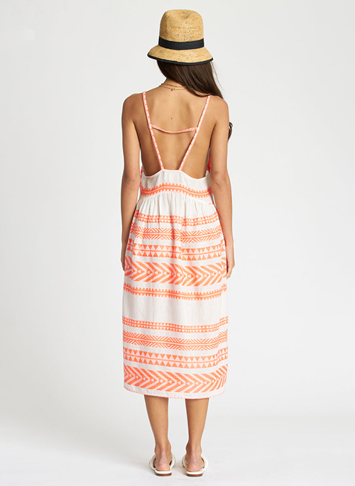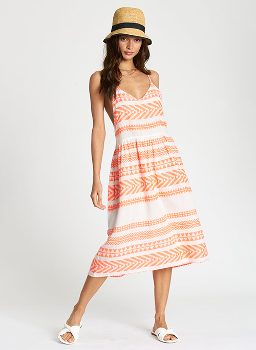 With its sweetheart neckline and low back detail, this bestselling Monique dress, cut in a light cotton gauze fabric of neon orange stripes against an off-white ground, is both fanciful and feminine. Spaghetti straps and flared, midi-length skirt, this silhouette gives off a laid-back look of natural sophistication.