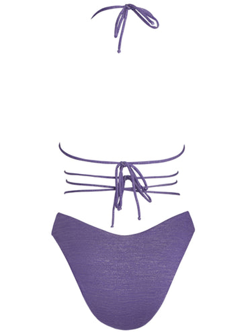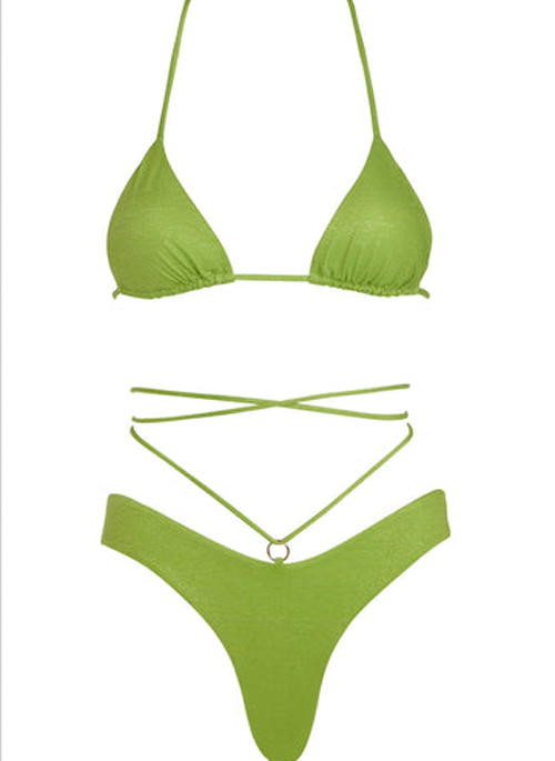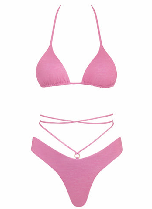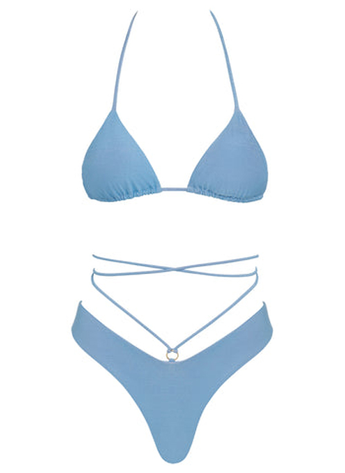 - Narrow strings connect to gold ring in front and criss cross around waist and can be tied in front or back.