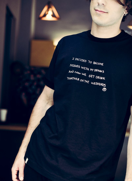 We have collaborated with poet/artist -M- on a limited-edition capsule collection. Crafted from organic cotton, this T-shirt features the lyrics, “I decided to become friends with my demons and now we get drunk together on the weekends” embroidered on the chest.