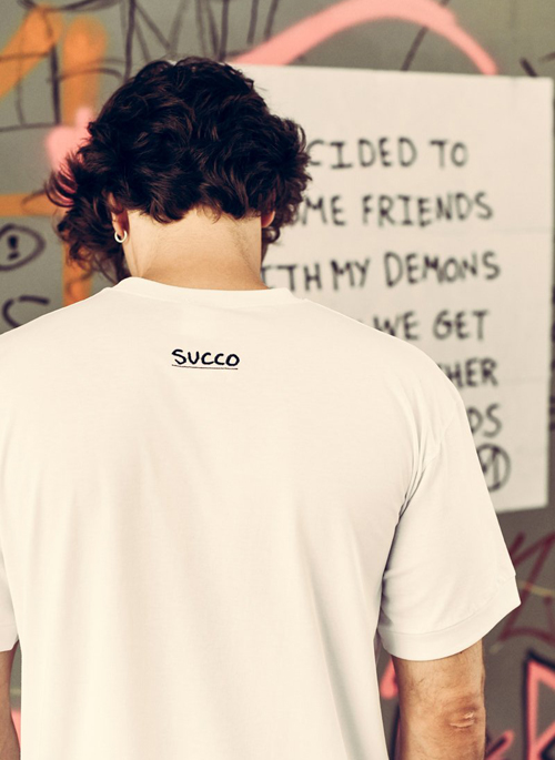 We have collaborated with poet/artist -M- on a limited-edition capsule collection. Crafted from organic cotton, this T-shirt features the lyrics, “I decided to become friends with my demons and now we get drunk together on the weekends” embroidered on the chest.