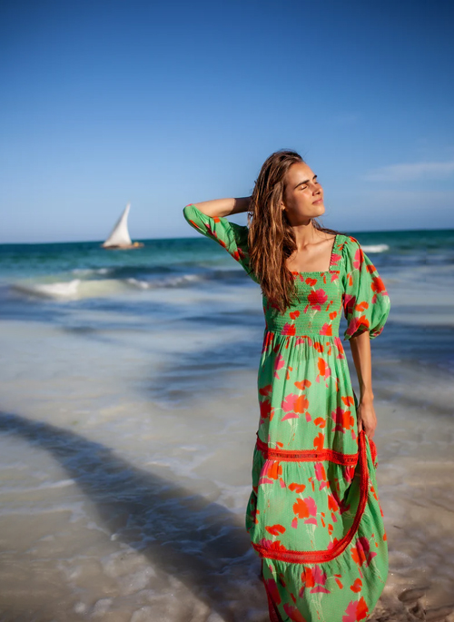 Our airy and super-packable new Mabelle dress can be worn countless ways, all of them fabulous. The whispery ankle-to-shoulder cotton gauze feels delicious against your skin and the tiered layers trimmed with crochet lace swoosh with every step. Wear it barefoot on the sand or lounging around the cabana. Slip the sleeves off your shoulders and use the detachable rope belt to cinch your shape for sunset cocktails.