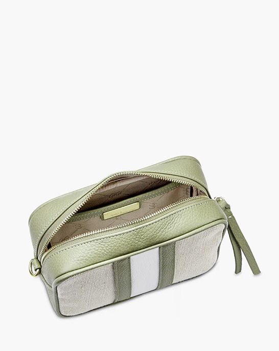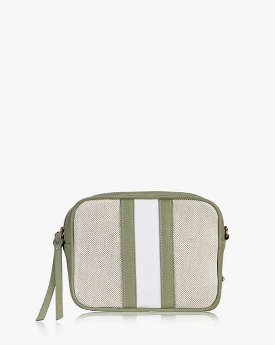 Maddie Crossbody bag features Italian Canvas and Calfskin leather with a custom stripe design. Maddie is a compact bag with a leather zipper pull—sized to fit the necessities.