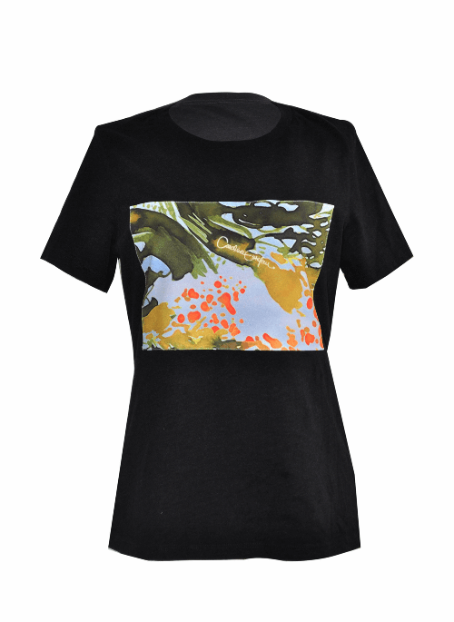 The Magma T-shirt is a black loose fit t-shirt with a cool piece of our statement eclectic colorful print at the chest area in the front. This piece can be worn in a casual look, but also with one of our skirts in the same print.