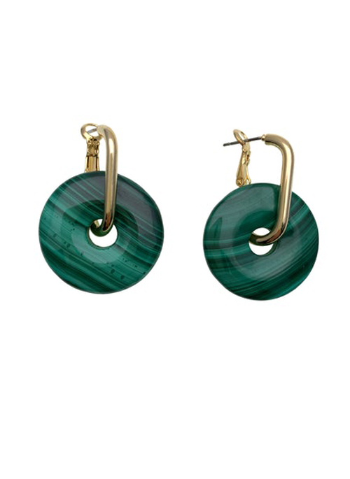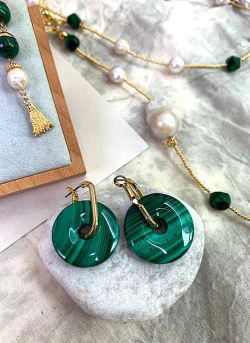 This pair of earrings is made of malachite with Japanese gold plated brass findings. It's simple, sophisticated, and can be worn with a blouse, knitwear, or a dress. Match with our Farra malachite necklace to complete your look!