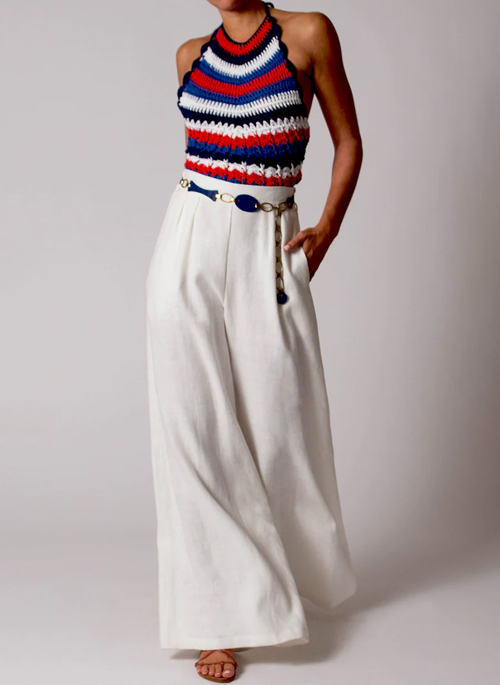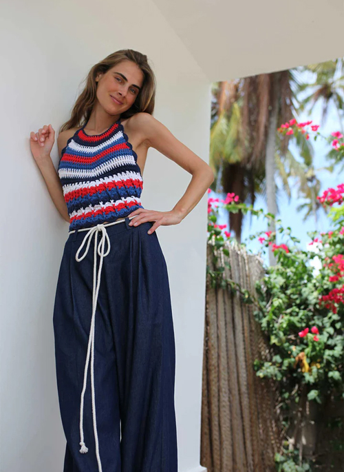 Tie on our handknit Malen top in this bold nautical colorway and go make some waves. Pair it with our Ainsley linen pant in denim, your favorite white Pamela pant, or just your bikini bottoms for an all-day boat adventure or lounging beachside. Each piece is handknit by women artisans in Bolivia and no two pieces are ever alike.
