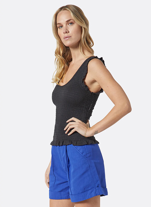 Ruffled edges, smocked bodice, and a soft, round neckline, The Mallory is an upgrade on the basic tank. A new wardrobe essential, this top is so versatile you can wear it anywhere with the right pants.