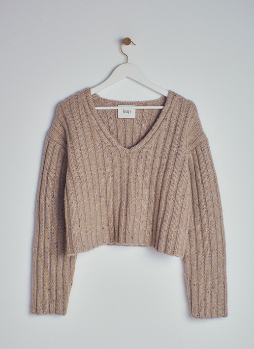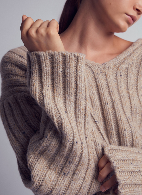 Ribbed sweater with rustic look and clean edges .Cropped style with V-neck. Dropped shoulders for relaxed fit. Used sustainable yarn which is a blend extra fine merino wool certified by Responsible Wool Standard (RWS), Alpaca wool and Recycled Nylon.