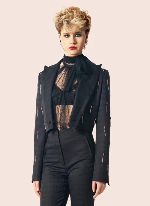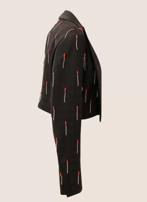 Black cropped tuxedo jacket with tone-on-tone houndstooth texture with embroidered stones. Wide satin lapels with fitted sleeves.