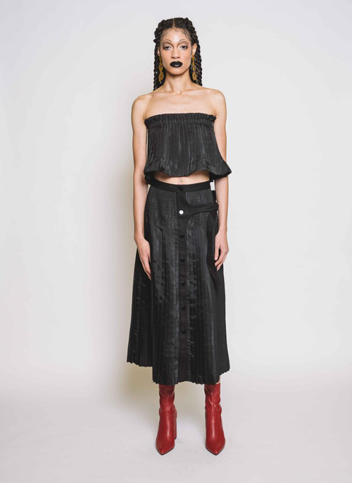 The Marcy Pleated Crop Top features an elastic tunnel with knife pleats to enhance the texture of the shiny polyester. With a sweeping silhouette that was expertly tailored for movement, its perfect for a night on the town.