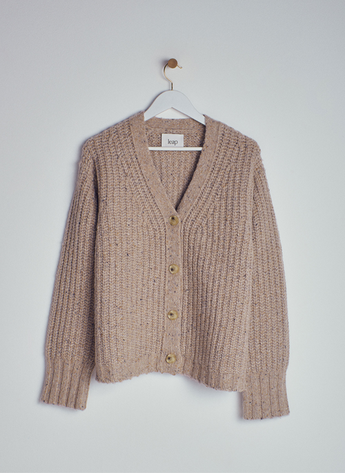 Chunky knit cardigan with rust look. Ribbed cuff detail. Dropped shoulders and oversize fit for relaxed feel.