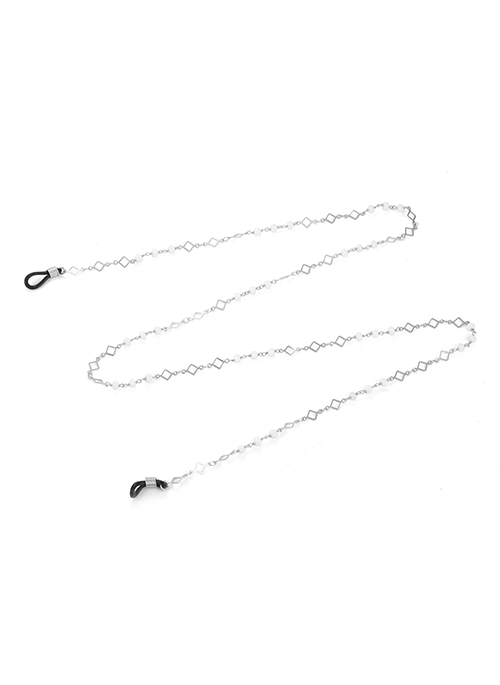 Details: We recommend tying the silicone twice around your glasses to avoid them slipping. Dimensions: 76 cm Materials: White Beads, Brass & Silver Dye