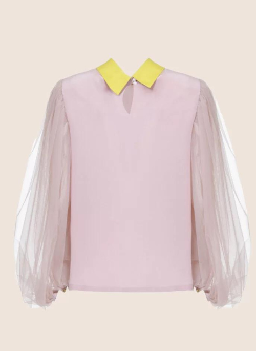 Pink silk crepe blouse with pink tulle puff sleeves and yellow cotton shirt-style collar.
