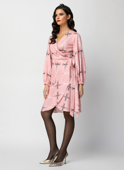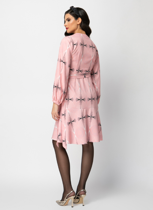 "Marilyn" dress will become your 9 to 5 dress! Cut from a mid-weight airy fabric with a V-neckline and flouncy ruffled hem, this easy, wrap around dress is the dress you want to reach for day after day! We have added some drama with the statement balloon sleeves, our two exquisitely placed, "Palmagic Black" + "Fantastic Pink" prints and that sash belt that helps define the pretty wrap front. No need for extras MAnnequin girl! You are good to go!