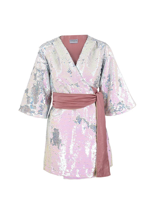 Created in flip multi facet sequins with a rose satin lining. A Stylish wrap dress with 3/4 Kimono sleeves. This dress can be worn as a mini dress at special occasions. You can even pair with your jeans for a relaxed dress down look. Wrapping one side across the other to create a v shape at the neckline. Knot the attached ties that wrap around the waist. Hugging your curves and accentuating the waist.