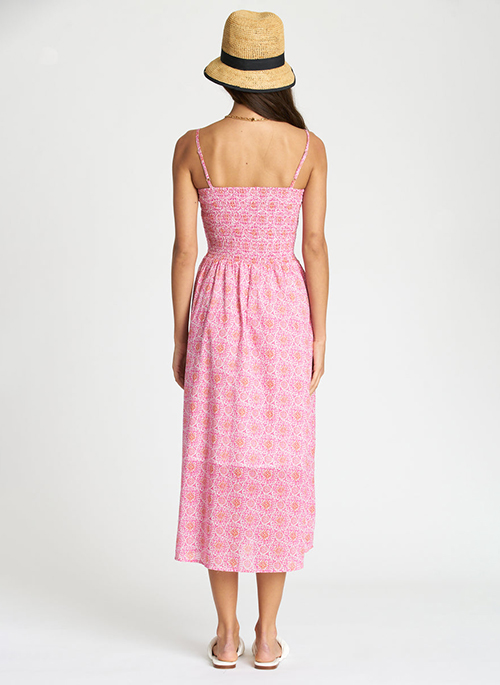 With its A-line midi-length hem and smocked bodice, this Matilda Dress creates a beautiful bohemian profile juxtaposed by intricate details. Cut in an alluring cotton lawn fabric with a delicate pink and white floral print, this dress is topped off with adjustable dainty straps and tassel detail. Blending simplicity with elegance, this silhouette offers a fun and flirty springtime look.