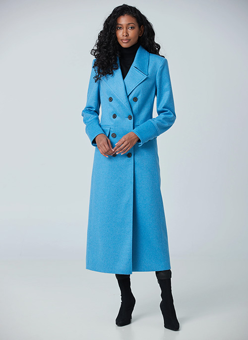 Maxi double breasted coat made in a beautiful palace blue color in a wool mixed fabric. A statement piece to have for the fall season.